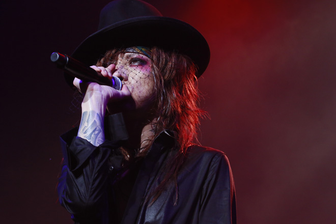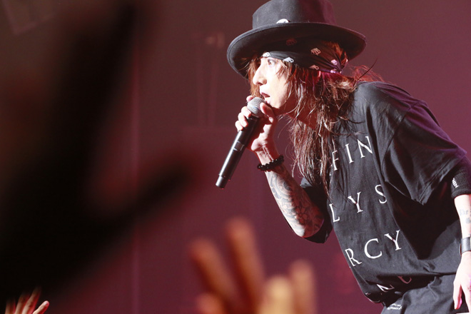 開演予定の17時半から25分ほどを経過した頃、充分すぎるほどに焦らされた群衆で埋め尽くされた場内が暗転。ステージ上、配置についた5人の男たちがオープニング映像に導かれながら、まず演奏し始めたのは「Missing Glory(狂人)」だった。正面を網で覆われたその光景と、黒ずくめのメンバーたち、そして血まみれの包帯で両手を巻かれたフロントマンのたたずまいは、明らかに昨春に行なわれた黒夢の<地獄ノ三夜>を彷彿とさせるものだった。
