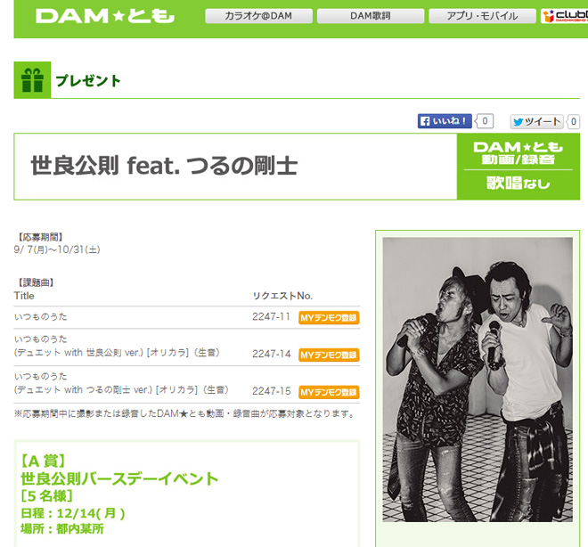 世良公則 feat. つるの剛士名義でのシングル「いつものうた」(9月16日発売)のリリースを記念して、世良公則バースデーイベントの招待状や世良公則&つるの剛士サイン入りポスターが当たるプレゼント企画が、DAM★ともでスタートした。