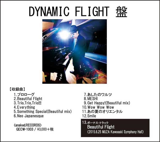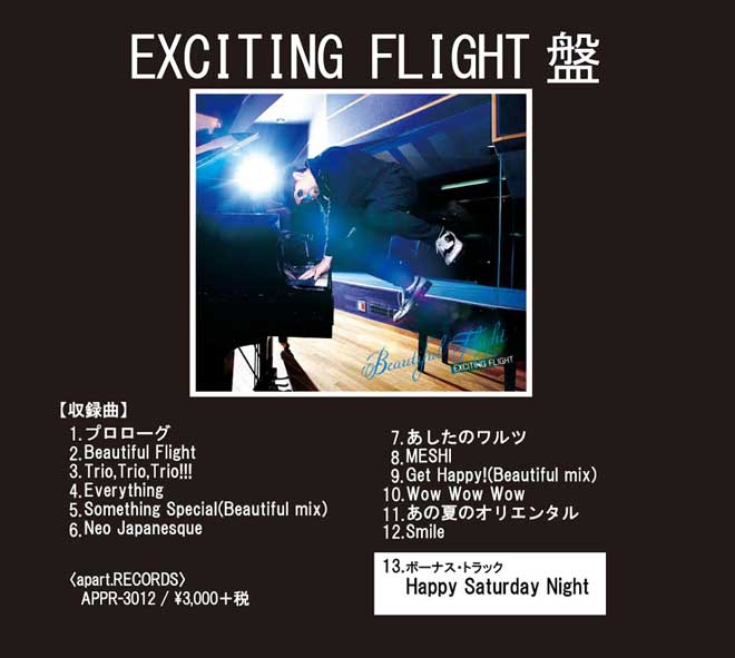 今回、DYNAMIC FLIGHT盤とEXCITING FLIGHT盤の2形態でリリースされ、2月から8月の間に8作連続で配信限定リリースしたシングルに加え未発表の音源を4曲収録。収録曲のレコーディング全てに高音質ハイエンド機材を使用しており、3人の生楽器演奏を細部まで聴きとることが出来る仕上がりとなっている。また、「Get Happy !」「Something Special」には“Beautiful mix”と名付けられた新たなMIXが採用され、楽器一つ一つの音が鮮明で臨場感を味わうことができるという。DYNAMIC FLIGHT盤にはボーナストラックとして6月にクラシックホールで公開レコーディングが実施された「Beautiful Flight」(LIVEバージョン)、EXCITING FLIGHT盤にはH ZETT M がパーソナリティーを務めているFMラジオ番組のテーマソング「Happy Saturday Night」が収録される。