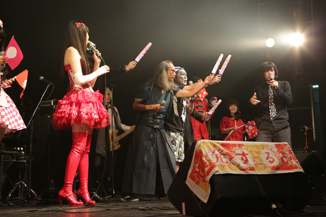 それらの告知の後に、アンコール曲「都会のアリス」を歌い、本日の出演アーティストをアーバンギャルドがステージに呼び込み、2014年のアンコールでも出演アーティスト全員で歌った<鬱フェス>版の「サライ」とでも呼ぶべきアーバンギャルドの楽曲「ももいろクロニクル」で大団円を迎えた。
