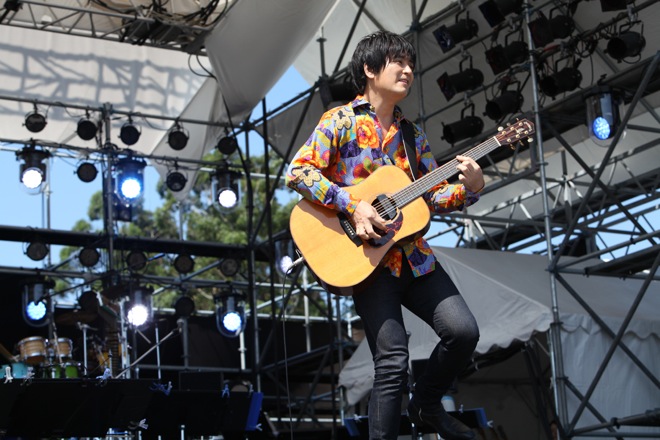 観客の視線が再びBONANZA STAGEへ戻ると、<情熱大陸フェス>定番とも言える押尾コータローが、早くも登場。12年前から連続してこのステージに立ち続ける押尾氏は、アコースティック・ギター1本だけで、バスドラムのようなパーカッションから、ベース・サウンドまでを変幻自在に奏で、そこに、ある時は力強く、ある時は繊細にメロディを重ねていくという超絶パフォーマンスで、13,000人の観客を魅了した。葉加瀬氏とのコラボレーションによる「Big Blue Ocean」では、チェリストの柏木広樹も加えた3人編成で、弦楽器アンサンブルを優雅に響かせながら、曲中で観客にウェーヴのパフォーマンスを促すなど、会場全体の一体感を楽しむ余裕も見せるなど、さすがの貫禄あるステージを展開してくれた。