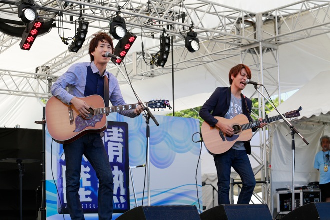 JOUNETSU STAGE出場2番手は、シンガー・ソングライター上田和寛とサウンド・プロデューサー/ギタリスト杉山勝彦から成るUSAGI。かつて、年間200本以上のストリートライヴをこなしていたというだけあり、演奏力はもちろん、観客の掴みもバッチリ。今回、葉加瀬氏とのコラボレーションが実現出来なかったことを残念がりながら、「来年、USAGIがあちらの(センター)ステージに立てるように、応援よろしくお願いします。聞こえていないと思いますが、太郎さん、よろしくお願いします!(笑)」とユーモアを交え、場内を大いに沸かせた。