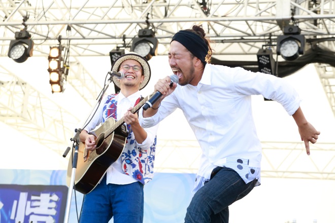 クリス・ハートの歌声が心に響いた後、JOUNETSU STAGEからは、奄美大島在住の2人組ユニット、カサリンチュによる軽快なヒューマンビートボックスのリズムが響き渡る。7回目の出演となる彼らは、<情熱大陸フェス>ファンには、もうお馴染みの存在だ。もちろん、彼らもこの会場の空気感を熟知しており、クイーンの名曲「We Will Rock You」のリズムに、ラップ調のMCを軽快に乗せ、グイグイと観客を引き込んでいく。一方で、デビュー当時から歌い続けている「故郷(ふるさと)」をしっとりと聴かせると、ラストは一転、いかにも南国のハッピーなノリで「やめられないとまれない」を演奏し、この”お祭り”気分を大いに盛り上げてくれた。