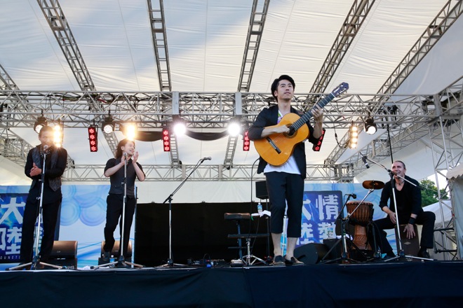 続いてJOUNETSU STAGEでは、沖仁によるフラメンコ・ギターが、夢の島にスペインの風を運んでくれた。パーカッションと、2人のパルマ(手拍子を演奏する人)編成で行われたステージは、「禁じられた遊び」から始まり、「こんな暑い日に、さらに熱い曲を用意してしまいました(笑)」というMCで、<情熱大陸フェス>をイメージして作られたオリジナル曲「乱れ咲きフローレス」を披露。こういった沖氏の演奏は、このフェスに通い続ける観客にとっては、欠かすことのできないステージのひとつと言えるだろう。しかしながら、このような本場フラメンコ・ギターは、よほどの音楽通でなければ、なかなか体験できるものではない。ましてや、ポップス系のフェスにおいては、なおさらだ。そこまでもカバーする幅広い音楽性こそが、このフェスの大きな魅力。藤井氏のエンタテインメント性の高いステージを観た後に、沖氏の本格的なフラメンコ・ギターが楽しめるという振り幅も大きさは、このフェス以外では決してあり得ない、<情熱大陸フェス>の醍醐味と言えるだろう。