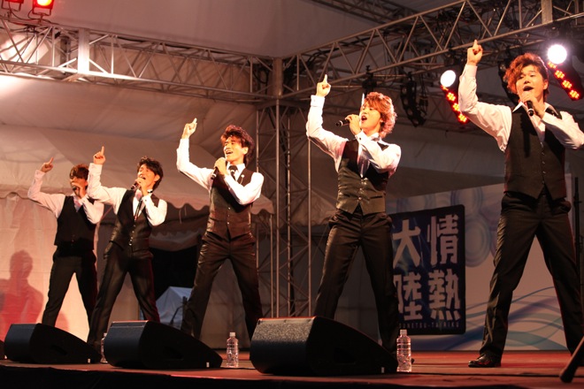 JOUNETSU STAGEでの最後のパフォーマンスは、男性ヴォーカルグループLE VELVETS。ユーモア溢れるMCを挟みながら、クイーンの有名曲を集めたメドレー「Queen Must Go On」や、クラシック音楽の名曲「Nessun Dorma(誰も寝てはならぬ)」など、誰もが知る聴き馴染みのある楽曲を、3人のテノールと2人のバリトンで、美しくも力強く歌い上げた。クラシカルな要素とポップスを融合させたハーモニーは、夕暮れの野外に気持ちよく鳴り響き、観客は余韻に包まれていた。