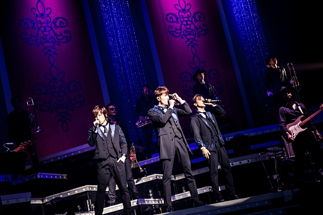 続く「Million Dollar Girl」でも橘慶太(Vo)が駆使するハイトーンボイスは流石の一言。緒方龍一と千葉涼平が合いの手で入れるコーラスも甘く響きわたる。ダンサー4人を加え、スーツ姿で一糸乱れぬダンスパフォーマンスを繰り広げながらメンバー3人ともが安定したボーカルワークを見せてくれるところはw-inds.ならではだ。