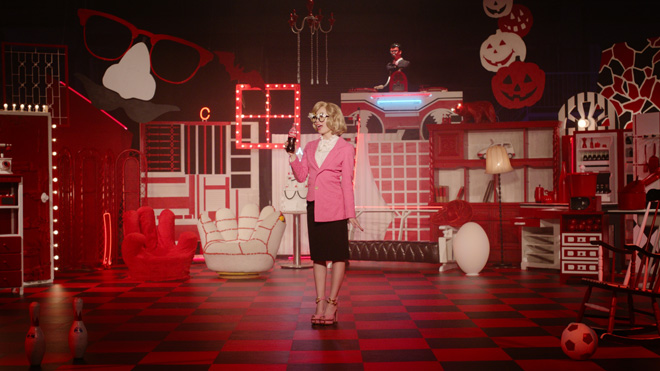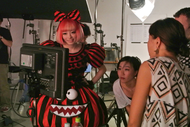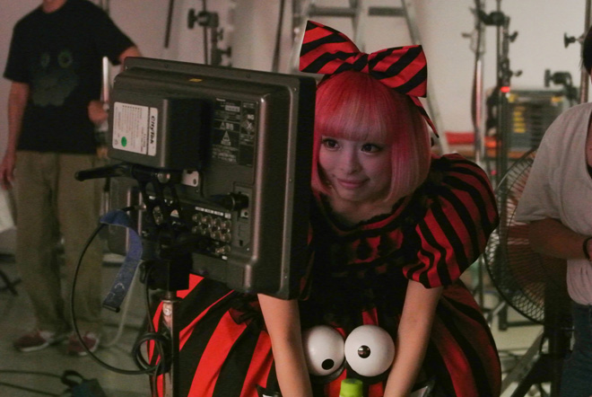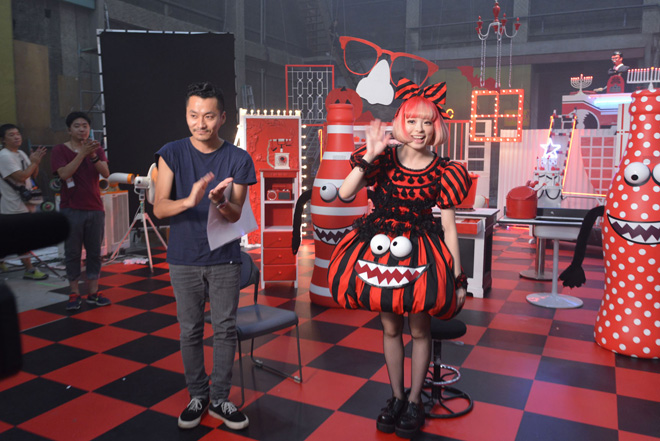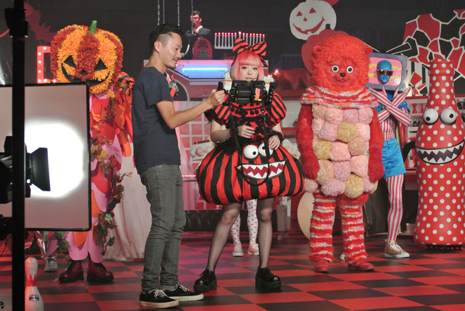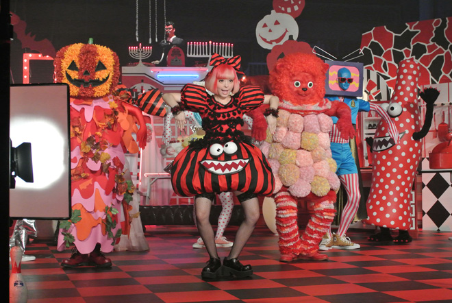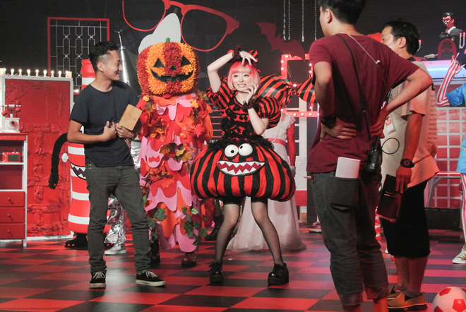 この撮影は、8月上旬に都内スタジオで行われた。ちょっと奇妙なハロウィンホームパーティーをイメージした赤、黒、白で統一されたポップな雰囲気のセットに「わー!かわいいー!」と高テンションのきゃりーは、赤と黒をベースカラーとしたかぼちゃをかたどったオリジナルのハロウィンドレスを着用して撮影となった。ウレタン素材のテレビ形モチーフを頭にかぶったハロウィンキャラクター“スーパーヒーロー”や、モコモコ素材でできた“犬”の着ぐるみに「頭、重くないですか?」「暑くないですか?」と気遣いつつも、「キャラクターもかわいい!」と、共演者とコミュニケーションを取りながら、スタジオを和やかムードで包んでいた。