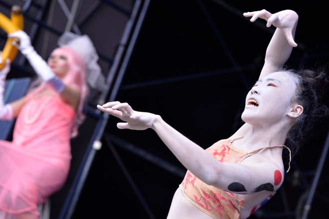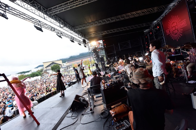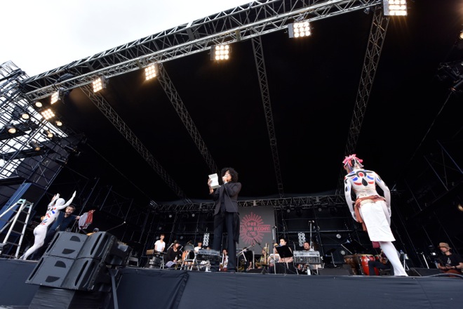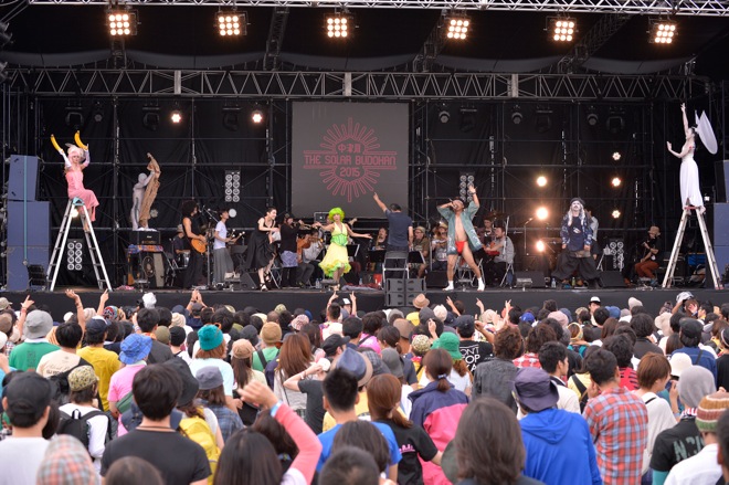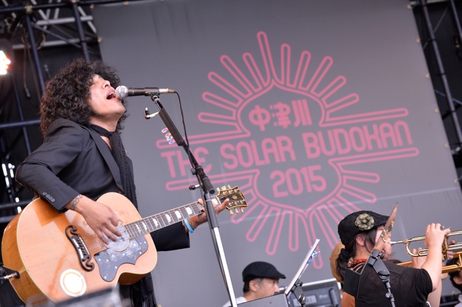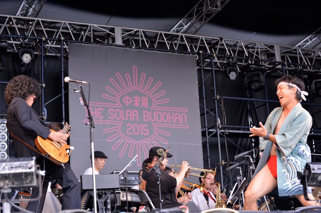 「もう一度世界を変えるのさ」を歌い終えた佐藤タイジは、アコースティックギターからレスポールにチェンジ。そこへ「中津川 THE SOLAR BUDOKAN!」と叫びながら、お馴染みの玄界灘ハッピにねじりハチマキ、赤フンドシ姿のパフォーマー・玄界灘渡部が登場した。ドラム、パーカッション、ベース、ホーンセクションなど数々の音のなかを佐藤タイジのエモーショナルなギターソロが加わる。さらに、競い合うように音をぶつけ合うコンガとグロッケンにトランペットが切り込んできたかと思えばテナーサックスのソロへ。ステージ上は全身白塗りになった男女の舞踏家が両手を広げてゆっくりと体をくねらせた。家族連れも多い<中津川 THE SOLAR BUDOKAN 2015>だが、小さな子供たちもその光景に見入っていたのが印象的だった。