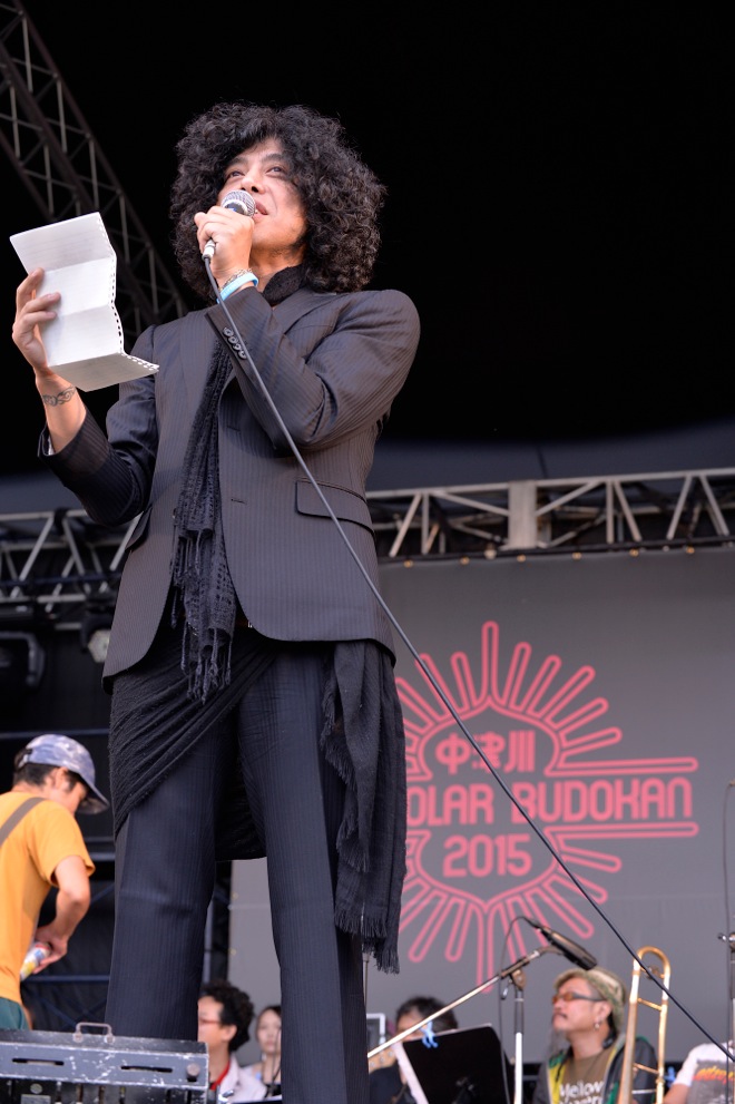 「3年目の今年はレイアウトを変えてバージョンアップしました! 特にREDEMPTION STAGEはだいぶ立派になりました。キッズエリアも大きくなって、私たちは着実に成長しております。今年のテーマは、“LOVE CHANGE THE WORLD”。愛が世界を変えるのです。国民の声を無視するどこかの国の政府や自分たちが作った素晴らしい憲法を踏みにじる権力者には世界は変えられません。私はそう思います。昨日、小学校でワークショップをしてきました。子供たちは満面の笑みで、“愛し合ってるかい?”と私に呼びかけているように見えました。愛し合いましょう! 私たちは大人なのです。音楽は必ず平和に続く道へ導いてくれます。音楽はこの星の奇跡的な愛の結晶なのですから。<中津川 THE SOLAR BUDOKAN 2015>、ここに開催します。今年のトップバッターは渋さ知らズオーケストラ!」──佐藤タイジ