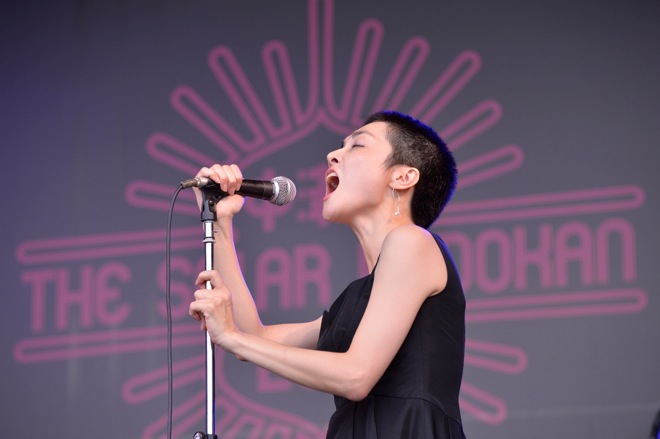 ボーカル・玉井夕海の想いを振り絞るかのような歌が静かに響き、やがてそれが大きなうねりとなって会場全体を支配する。歌と演奏が圧倒的だ。その演奏が頂点に達したときに曲は新展開へ。トランペットが猛り狂ったように空へ向かって咆哮すると、“テュラテュラテュラテュララー”とバンドが一斉に音を出す。ロシア民謡「一週間」の歌のメロディだ。渡部がマイクを握り、「世の中がきな臭くなっております。みんな、適当で良いから一緒に歌ってくれ!」と呼びかけ、オーディエンスにマイクを向けた。バンドが演奏を止め、会場中の人が手を叩きながら一斉に“テュラテュラテュラテュララー”のシンガロング。