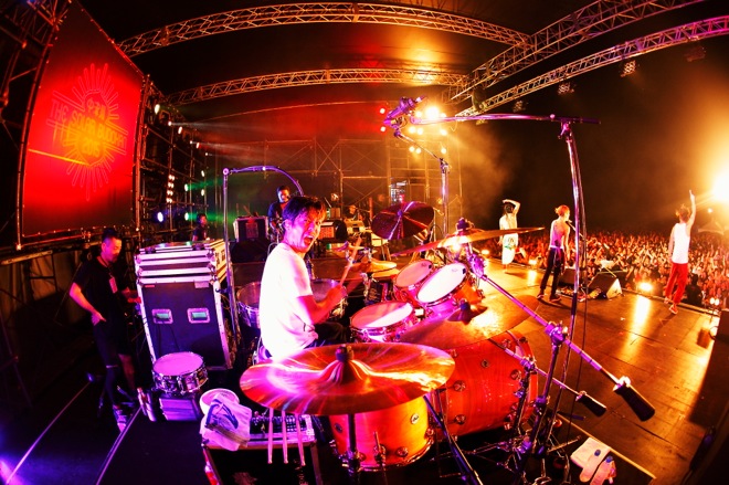 上半身裸でギターを抱えて歌うKjが、「なんだ、寝てんのか!? 聴こえないよ!」と叱咤するように叫び、気合いを入れ直したかのようにオーディエンスが応える。「飛び跳ねろー!」とさらに煽るKjに合せて会場中が飛び跳ねていると、ステージ上段のATSUSHIがDragon Ashと書かれたタオルを広げて、さらなる歓声を呼び込んだ。桜井誠(Dr)が重戦車のようなバスドラの連打で曲を終わらせると、「Run to the Sun」へ。太陽をテーマにしたこの曲は、今日のライブに相応しい曲といえるだろう。