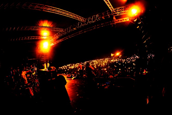 ステージ付近の照明をすべて消すようにスタッフに指示すると、「携帯とか持ってる人!」と呼びかけてからオーディエンスにかざすように伝え、携帯のライトでいっぱいの光景が会場に広がった。
