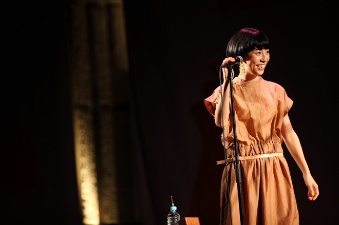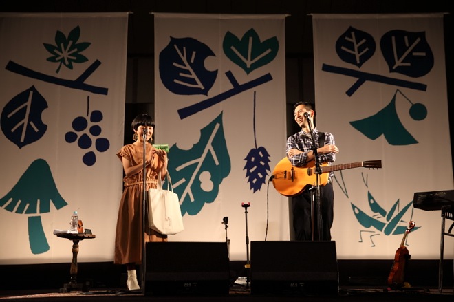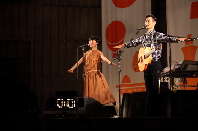 まずは挨拶。「オイッスー!」と佐藤良成、「どうもどうも~」と佐野遊穂。お客さんに向けた呼びかけやMCはあくまでもユルいので、もう心が落ち着く空間が出来上がる。ライブは、「いついつまでも」からそのまま「夜明け」へ流れて始まった。「いついつまでも」はミサワホームのCMソングで、現在はハンバートが歌を担当している(ここで楽曲試聴できる http://www.misawa.co.jp/song/)。感動的なコード感で曲は始まっていくので早くもグッと来てしまうが、「ミサワ~ホーム~~」というサビに来ると「あ、この曲か!」という理解と笑いとともに会場からは自然な拍手が起こった。のちにMCで語ったように、ライブでこの曲をやることに二人は「味をしめている」らしく、先日のフジロックでもド頭に披露していた。