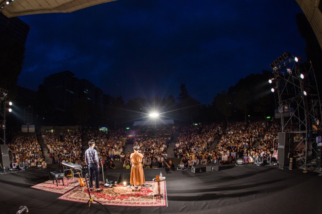 ハンバートハンバートが、9月19日(土)に日比谷野外大音楽堂にて単独ライブ<二人でいくんだ、どこまでも>を行なった。タイトル通りに、ハンバートハンバートが二人っきりで臨んだこの日のライブの模様をお届けする。