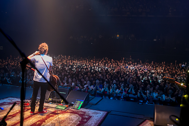 ライブ中盤はアコースティック・セット。特に目を引いたのは厳かなイントロで始まったインストゥルメンタルの「HOME」。徐々に熱量を上げ、壮大なまさにレクイエムが会場中の目とそして耳を奪った。その後の客を煽った後のMCでは「今ので息切れしてしまった、45歳とはこういうことなのか?」と笑いも誘った。