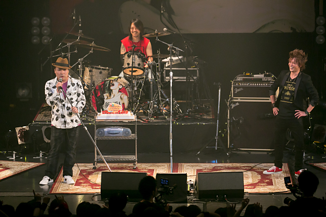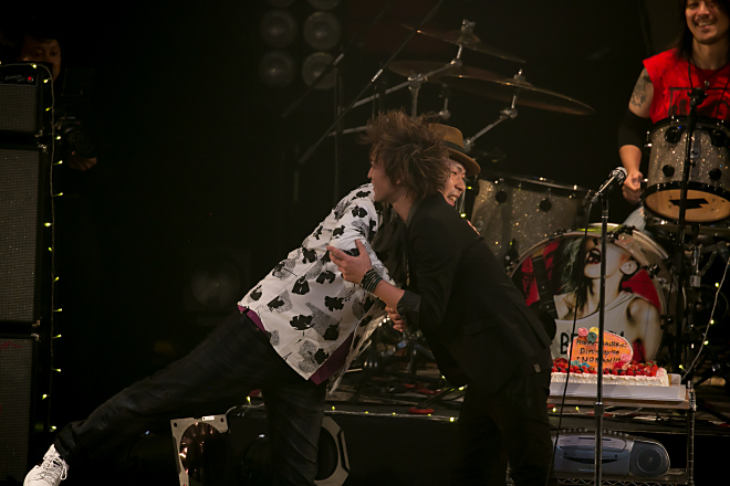 もはやライブでお馴染みのコーナーとも言える謎のメキシコ人シコ ;zo ではなく、本日の「B-DAY」にはなんとスペシャルゲストにLUNA SEAのドラム真矢がバースデーケーキとともに登場。「本当にこのツアー最高でした!」とツアーに参加してはいない真矢が笑いをとるも「じゃあ、みんなで「ハッピーバースデー」を贈ろう」と会場みんなで祝いの合唱。このために盟友は出番ギリギリに駆けつけていた。