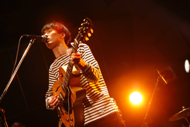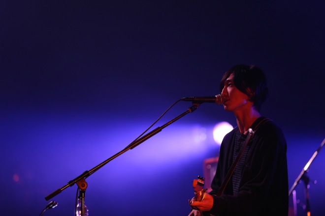 メインステージの迫力にも動じず、自分達の音楽を堂々と貫いたのは神戸発のプププランド。軽快なフォークロック「メトロ」に始まり、西村竜哉(Vo, G)のかすれた歌声がエモーショナルに染み渡る「BABY」を届けた。更に、この日から新体制として新たに迎え入れたサポートドラマーが、口火を切って「ミスタームーンライト」へと続く。このロマンチックなナンバーに合わせて、西村が思い立ったかのように「地元・六甲山の夜景に見立てた照明をお願いします!」とマイペースな演出で笑いを誘う。センチメンタルな歌詞とグッドメロディをしっかりと聴かせるライブは、人柄が滲み出ていて求心力があった。