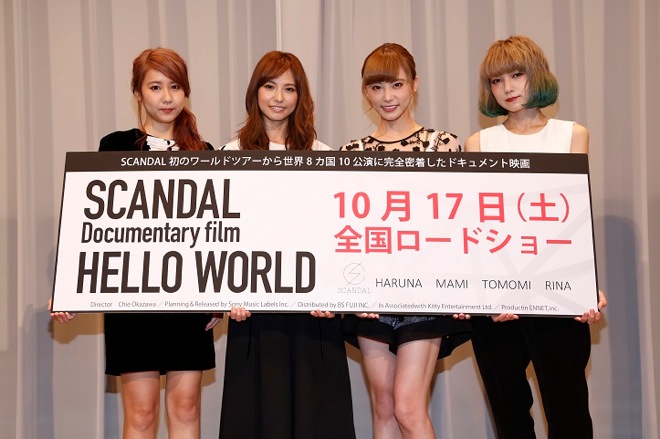 SCANDALが10月17日より、ユナイテッド・シネマほか全国の映画館にて初のドキュメント映画『SCANDAL “Documentary film「HELLO WORLD」”』を公開する。同映画は海外8ヶ国全10公演に完全密着した映像であり、ドラムRINAの涙や丸裸なメンバーの姿が盛りだくさんに収録されたものだ。その公開に先駆けて10月4日、都内にて最速先行上映会が開催された。