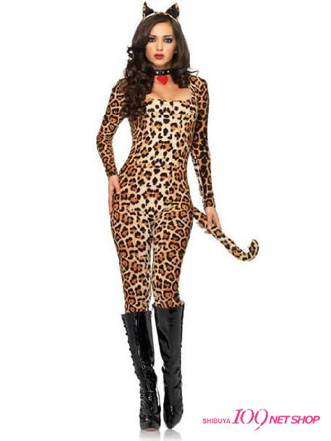 ヒョウ柄のボディスーツ、ヘッドバンド、チョーカー、しっぽの4点セット。ボティスーツにはファスナーが付いておらず、生地が柔らかくよく伸びるので着心地は抜群です。ボディラインを美しくみせるスーツには、ブラックのロングブーツを合わせたセクシーなコーディネートがオススメ!クールなコスプレを楽しみたいあなたにピッタリな一着です。友達と女豹グループを作って、ハロウィンの夜は狩りに出かけちゃう!?