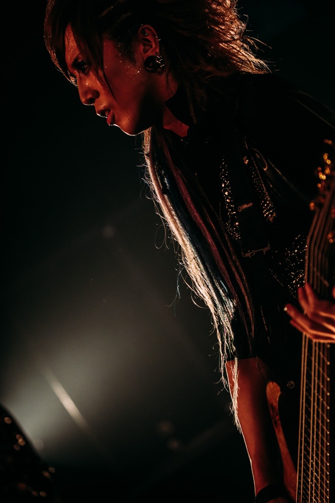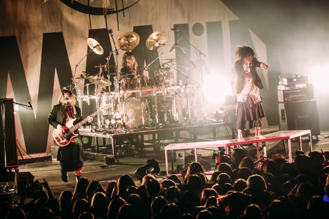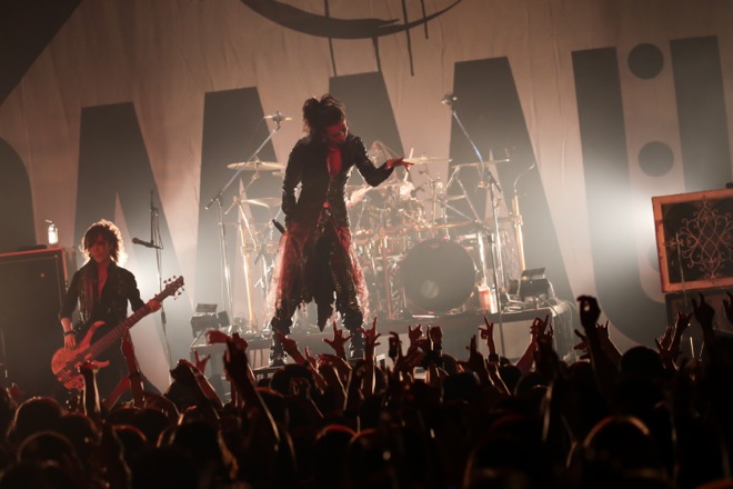 D’ERLANGERの余韻が完全に消え去らないうちに、最後に登場したのはもちろんMUCCだ。正直言って、もはや何も言うべきことがないというくらい、彼らのステージは研ぎ澄まされていた。扇動力、クオリティ、安定感、流れの良さ、メンバー個々の際立ち方……何もかも必要なものが揃っているという印象だし、すっかり横綱相撲が取れるバンドになっていた。しかも彼らは、「遺書」ではNOCTURNAL BLOODLUSTのCazquiを、「蘭鋳」ではDEZERTの千秋をゲスト・ギタリストとして迎え入れ、ツイン・ギター体制でこれらの楽曲を披露してみせた。が、それについても、“足りなかったものが足された”というのではなく、双方の曲の威力を増幅させるためのもの、といった感じ。MUCC自身にとってよりも、ゲストに招かれた2人の側にとって、“あの4人の狭間で音を出す”という経験は重要だったはずだし、MUCCというかミヤの側の狙いもそこにあったはずだ。そうした兄貴分としての自覚と配慮も、このイベントを締め括るバンドとして相応しいものだと思えた。