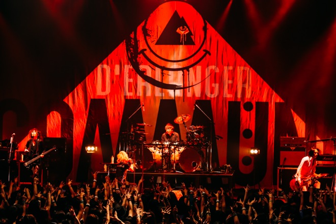 そして、次に登場したのはD’ERLANGER。近年のこのバンドのライヴには、本当にすさまじいものがある。kyoは「ポップで爽やかなD’ERLANGER」と自称しながら観衆を沸かせていたが、実際、音楽自体はとてもポップで甘美なのに、すべてに毒が盛られている。しかもこの日には、とんでもないサプライズが仕掛けられていた。「Angelic Poetry」が後半に差し掛かった頃、曲がいつもとは違った展開に転がり、kyoが「ハ~イ! ハ~イ! ハイハイハイハイ!」というコール&レスポンスを導いていく。おそらく観客の大半は「なんか昔っぽい煽り方だな」とでも感じていたに違いない。しかしそれが聴こえてきた瞬間、僕の両腕には鳥肌が立っていた。これは、彼らの直系の先輩にあたる44MAGNUMの代表曲のひとつ、「SATISFACTION」に含まれている展開なのだ。そして実際、前述のような客席との掛け合いを経ながら、曲はそのまま「SATISFACTION」へと移行し、着地点へと至る。44MAGNUMといえば、DANGER CRUEについて語るうえで欠かすことのできない、起源のような存在。いわば、自分たちをも含めた全出演者が忘れてはならない魂のようなものを、彼らは提示してみせたのだと思う。しかも彼らの演奏は、ラスト・チューンの「CRAZY4YOU」が終わると、そのままセッションになだれ込み、終わりの見えない演奏が続くなかで幕が下りていくという形で終了。途轍もないクールさだった。そしてそれは、先頃の対談のなかでセッションについて直訴していたミヤに対する、CIPHERからの回答であるようにも感じられた。