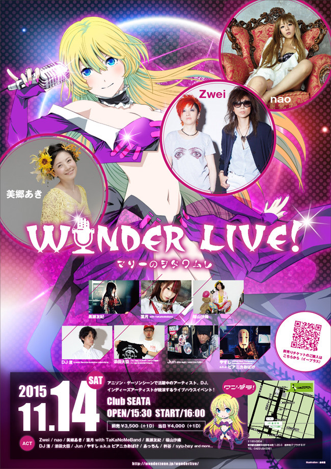 <Wonder Live!>はアニソン・ゲーソンシーンで活躍中のアーティスト、DJ、インディーズアーティストが競演するライブハウスイベント。Zweiはこの秋11月25日にニューシングル「ライア」(ゲーム『STEINS;GATE 0』エンディングテーマ)を発売することが決定しており、イベントでもそのパフォーマンスが期待される。