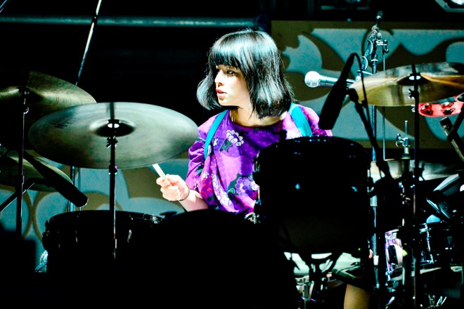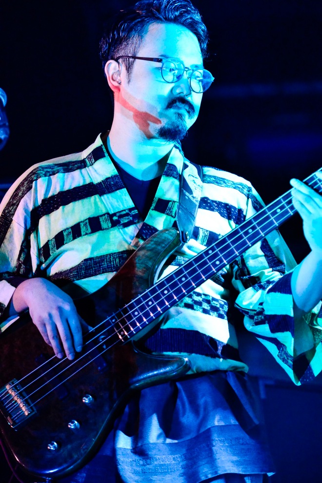 観客の胸が高まりながらもジーンとしているその矢先、いこかの怒涛のドラムソロ。好戦的でドヤな表情も含め、魅せてくる。川谷の「横アリ行けるかー!」という煽りと共に、とてもサイケデリックな「Ink」へ。無力感と焦燥感と冷静さが入り交じるという感情のカオスが、そのまま音像の化け物を創りだしてしまったような、すさまじいプレイだった。そこから間髪入れずにドラミングが曲間を繋ぎ、「餅ガール」の上モノの高速リフが鳴り響いた。この曲が終わったあとの、課長といこかのセッションが非常に興味深くて。音でなら合う、という感じが二人からは醸し出されていたからだ(笑)。話し始めると全然噛み合わないのに、ベースとドラムでは絶妙なタイミングを計りながら嬉々として呼吸を合わせてセッションする二人。MCなどで見せるふたりの関係性が本音なのか、キャラの設定上のものなのか、真意はわからない。もし後者だとしても、相容れない人間同士でも音が鳴り出せばリスナーを熱狂させるアンサンブルを行ってしまう、という妙技までプロデュースしているこのバンドは、音楽的なエンターテイメント性に溢れ過ぎている。