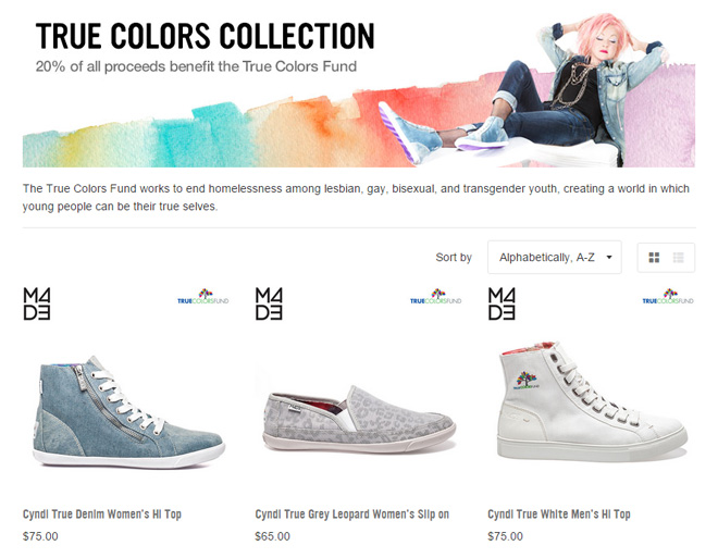 62歳になってもお洒落なシンディは、先月終わり、M4D3(Make A Difference Everyday)とコラボし、スニーカー・コレクション(3タイプ)を発表。収益の20%がLGBTの若者を支援し彼女が設立したチャリティーTrue Colors Fundへ寄付される。