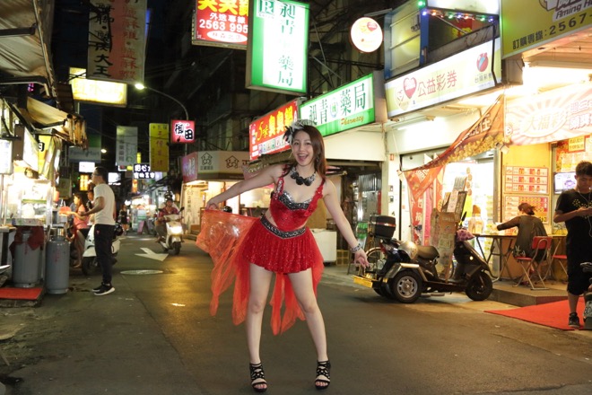 台湾最終日の単独公演終了後、台湾っぽい写真を撮影しようということで夜の街に。サンバ衣装というなかなか刺激的な衣装なため、周りの人たちの注目を集めるかと思いきや、日本と同じように、台湾の夜の街にも綺麗な夜のお姉さんたちが行き交っており、幸か不幸か思ったほど注目を集めず。ちなみに、きっかチーム一行で、そんなお姉さんたちにひとり積極的に声をかけていたのは他でもない吉川友である。
