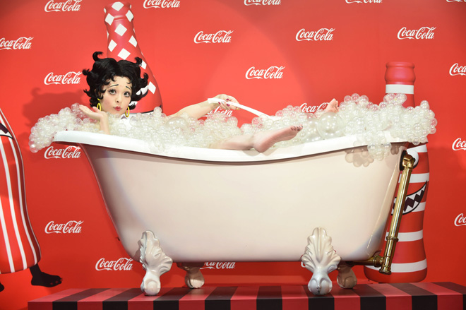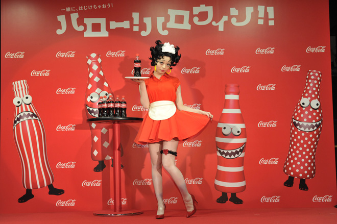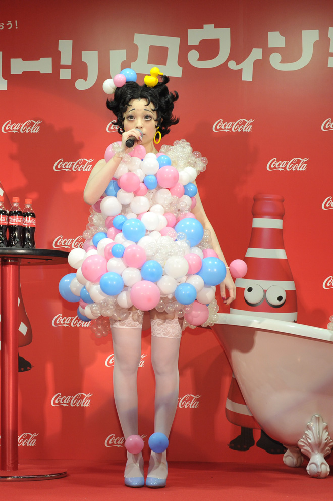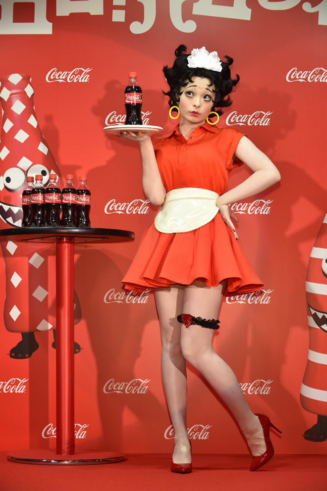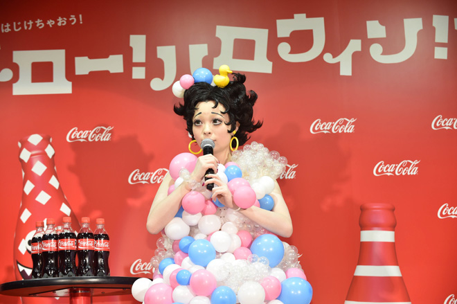 バスタブからあがったきゃりーは「ハロー」「ハロウィン!」の掛け声でコカ・コーラで乾杯、「おいしい!お風呂上りのコカ・コーラは最高です!」とゴクゴク飲みほした。今年のハロウィン衣装に関して、「今年の仮装は何をしようか、一生懸命考えました。日本人でベティちゃんをやったことのある人をネットで探しましたが、見つからなかったですし、ベティちゃんなら、海外のファンも喜んでもらえるかなと思い、選びました。すごく偶然ですが、ベティちゃんもコカ・コーラのお仕事をしていると知って、運命を感じました。黒髪、まつげを再現するのは難しかったですが、気合を入れました!」となかなかの手応えのようだ。