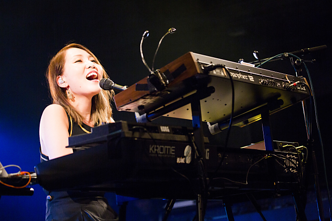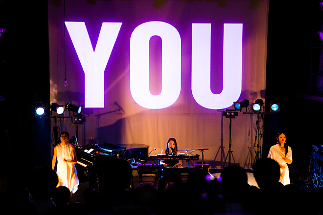 ラジオでのオンエアも相次いだ「YOU」を伸び伸びプレイした後は、扇情的な「美しいあなた」から世界観の広がりを感じさせる「Night Walk」へ。この曲ではなんと全パートを同時に1人でライヴ演奏しており、両手両足で何台もの鍵盤を操る姿は圧巻。MCでは「やっぱ一人ってね。孤独感がすごい。嫌いじゃないけど。だけど今までずっとピアノって横向いて演奏することが多くて、皆さんの顔見て演奏することがなかなかないんですね。なので“ずっとピアノの音を聴いて欲しい”とか色々な葛藤もあるなか、(今回は前を向いて)行儀の悪い足とかほとんど隠れたりしてる顔を見せるはめになっているんですけど。私はすごい楽しいです。意外と皆の顔が見えてるというか」とワンマンにあたっての思いがsébuhirokoから語られた。