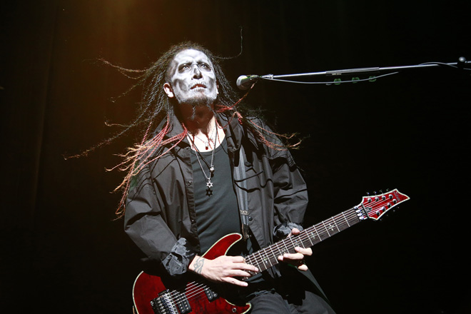 彼らがステージを後にすると、この夜の趣向に合わせたハードロック/へヴィメタルの名曲の数々が場内に響き渡る。焦らしに焦らされた観客が見守るなか、sadsが登場したのは午後7時20分。思わせぶりなSEが鳴り、メンバーが一人また一人とステージに歩み出る。スカルメイクを施した黒衣の従者、K-A-Z(G)、GO(Dr)、クボタケイスケ(B)の影が見えた途端に大歓声が渦巻く。そこへゆっくりと姿を現す悪魔の花嫁、清春(Vo)。彼の息を呑むような美しさに見とれているうちに、「evil」の轟音が炸裂し、邪悪なパーティーが幕を開けた。