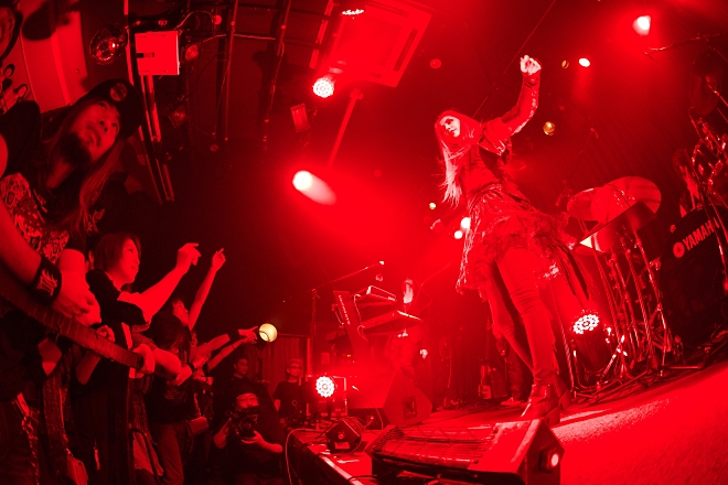 UROBOROSは「Black Swallowtail」を皮切りに、「IGИIS」、「Red Moon」、「十二夜」、「Luminous」と一挙に5曲を披露。小規模のライブハウスでのアクトではあったが、初ライブから極めて完成度の高いパフォーマンスでオーディエンスを魅了する。独自の世界観で構成されたテクニカルなナンバーをそれぞれのスペシャリスト達が弾きこなし惹きつけていく様は圧巻。ボーカルの上木彩矢は絶えず下から吹き上げる風を受けながら、マイクを前にカリスマ性すら感じさせる演技力でフロントを美しく務め上げた。