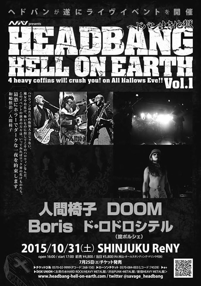 出演ラインナップは人間椅子、DOOM、Boris、そしてド・ロドロシテル(掟ポルシェ)という、まさに『ヘドバン』でしかあり得ない顔ぶれ。加えてライヴの合間の転換時には、同誌の相談役ということになっている筆者・増田勇一がDJを担当する。