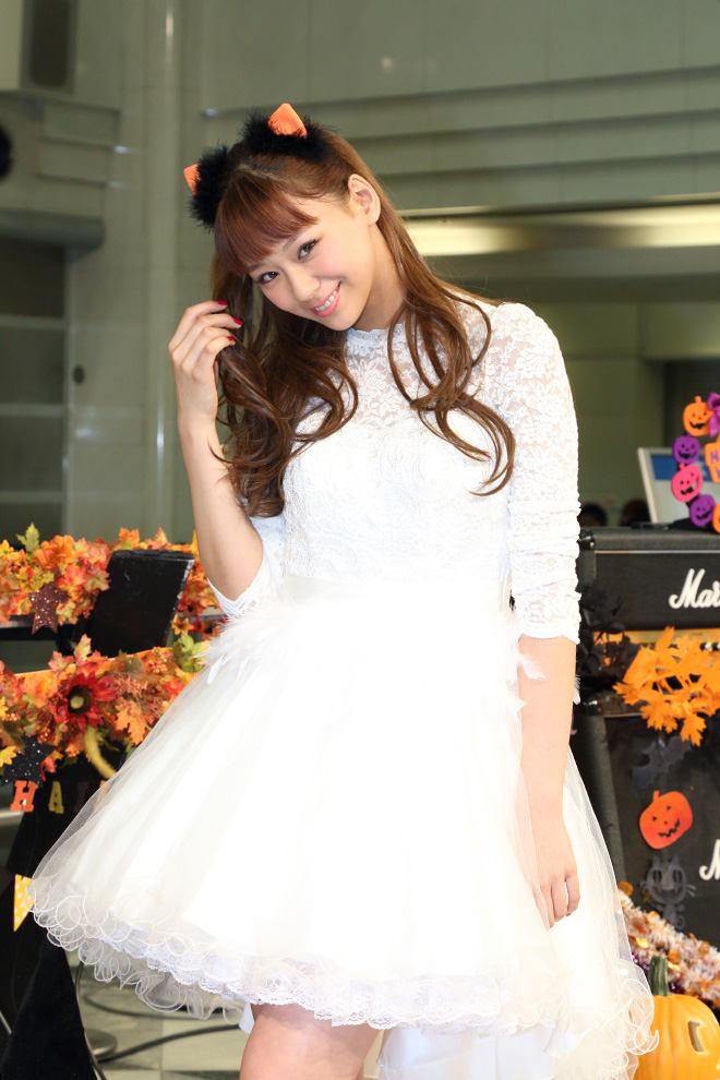 1stシングルのカップリングだった「恋はJ・E・L・L・O」からスタートしたイベント。天使をモチーフに、ウェストに羽がついた、レースとチュールのワンピース姿に、「ハロウィンの季節ということで、耳が生えてきちゃいました(笑)猫ちゃんになっちゃいました。」と、頭にネコ耳を着けて恥ずかしそうな西内。そんな仕草に、ステージを取り囲んだ1500人の観客から「可愛い!」の声が飛ぶ。すると余計に顔を赤らめて恥ずかしがってしまうというスパイラル。
