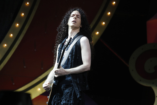 続いては「不思議の国のアリス」をモチーフにしたコスチュームのHKT48コーナー。指原が「ライブハウス武道館っ!声出していくぞっ!」とオーディエンスを煽って始まったのは、BOOWYのカバー曲「ONLY YOU」。サビのパートではメンバー16人と1万人が一体となってジャンプ。間奏に入るとステージ右手から現れたのは、ギタリストのマーティ・フリードマンだ。このサプライズにオーディエンスも大喜び。マーティの参加で武道館は一挙にロック色に染まる。このロックな勢いをそのままに指原と柏木と峯岸の3人でアン・ルイスの「あゝ無情」を歌い、再びAKB48メンバーが集結し、マーティのディストーション・ギターをバックにド迫力の「ヘビーローテーション」を披露。