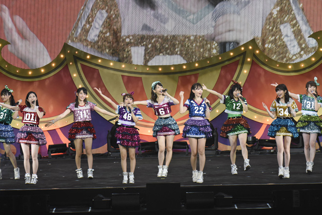 「おばけソング・パーティ」が終わると、ステージには今冬を目処に卒業する高橋みなみと横山由依が登場。ハロウィン・イベントなのに、次期総監督が全く仮装メイクしてないのは如何なものか(笑)?と高橋みなみが苦言を呈すると、ハロウィン仕様のメイクをしようとしたらライブの時間になってしまったと横山が返す。このマイペースさがAKB48に新しい風を吹かせてくれるでしょうと、後任を託す。この後、後半戦の「スペシャル・ヒットメドレー」に。「会いたかった」で初めてAKB48 & HKT48メンバー32人が舞台に揃う。AKB48、HKT48のヒット曲を立て続けに披露すると、客席のボルテージも最高潮に。「ヒットメドレー」のラスト曲の前に、メンバーからのプレゼントとして場内の仮装親子シートの下にクッキーを仕込んでいた事を明かすと、子供たちから可愛い歓声が上がる。さらに客席に向けてお菓子の入ったバズーカを放って、「恋するフォーチュンクッキー」で本編を締めた。