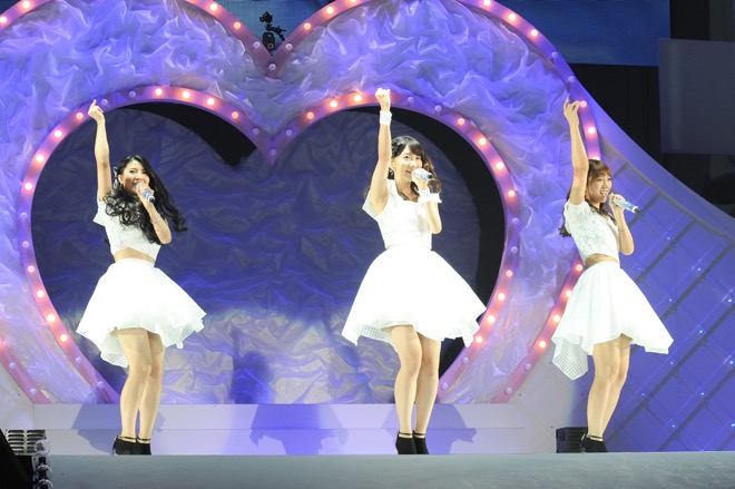 ライブには、3人のソロコーナーも用意された。柏木由紀は純白のドレスに身を包んで「あなたと私」を、感謝の気持ちと大好きの気持ちを込めて歌いあげる。一方、ブルーのチューブトップドレスで大人モードな高城亜樹が、切なさを滲ませて「二人だけの記憶」を歌えば、会場のペンライトは青一色に染まる。一方、深紅のドレスでステージに姿を見せた倉持明日香は、会場からの大きなコールに笑顔の花を咲かせながら「向日葵」を歌唱。両手を振ってファンの声に応えた。
