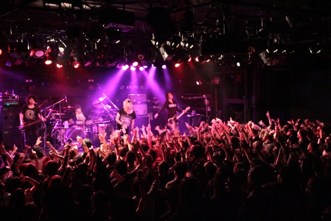 オープニングナンバーは「狂おしい夜について」。艶やかなkyoのヴォーカルに劇的な演奏が重なった瞬間、フロアのテンションが一気に上がるなど、バンドのパフォーマンス能力の高さが冒頭から証明される。セットリスト前半に配された「Dance with me」「SWEET EMOTION」をはじめ、ニューアルバムからの楽曲もオーディエンスには完全に浸透しており、バンドとの融合性も高い。