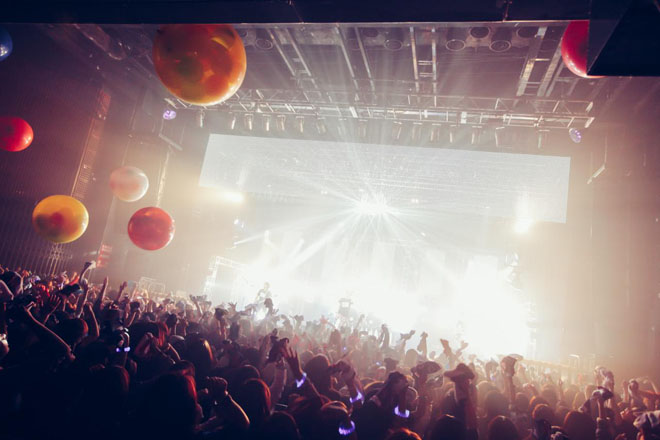 「今日はいつもと違うライヴを見せていく」とCHISAがMCで語ったように、演奏中も上部と後方のスクリーンに次々とド派手なイルミネーションが映し出されていく。さながら大型EDMのフェスを想起させる空間に、オーディエンスの興奮もどんどん高まっていった。「milky latte」「赤裸々ララ」「東京ネクロポリス博物館」など、演奏される楽曲に合わせて様々な“フリ”を見せる観客たち。驚くほど転調に富んだDIVの楽曲を象徴するかのごとく、その動きも本当にバラエティ豊かだ。手を振っていたかと思えば、隣と手をつないで左右に跳んだりと、息の合った動作が会場に大きな一体感をもたらしている。
