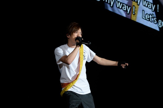 「最終日、やっぱり今年はこれかなと。まあ、仮装というか、“俺”なんですけどね。100kmマラソンを完走して、あの感動をもう1回味わいたくて、走っているときの歓声が沿道のみんなみたいで、あのときの声援と感動を思い出しました。ありがとうございます! ちなみにウチのギターのSHINPEIは今日、“樽美酒SHINPEI”としてやっているんですけど、8年間、BREAKERZとして活動してきて今日、初めてサングラスを外してライヴをやるという。きっと最初で最後だと思うんですけどね。今日はHALLOWEEN PARTY最終日なので、“MMI”で行きましょう!」
