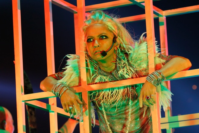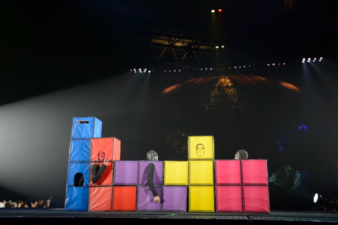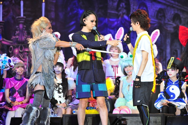 続いては、やまだひさしの進行による恒例の『HALLOWEEN COLLECTION』のコーナーだ。最終日もVAMPS審査により選ばれたオーディエンスが次々にランウェイに姿を現わす。歴代HALLOWEEN PARTYのHYDEの仮装を再現した総勢17名の“HALLOWEEN HYDE ORCHESTRA”に始まり、血まみれの羊2人組、ゴスロリコンビ、HALLOWEEN JUNKY ORCHESTRAのHYDEの仮装をしたかわいい3歳児、和装の9人組など、ヴァリエーションに富んだ濃い顔ぶれが、次々に登場し、テトリスを模した箱に入ってパフォーマンスする軍団も……と思いきや、箱から顔を出すその正体はカメレオのメンバーたちで、会場からは「マジで~?」の驚きの声が上がった。
