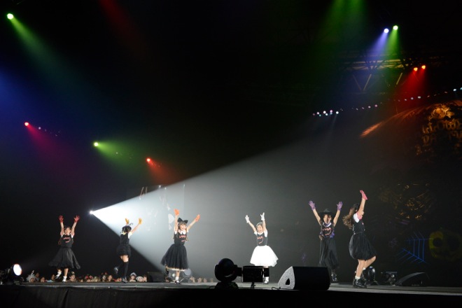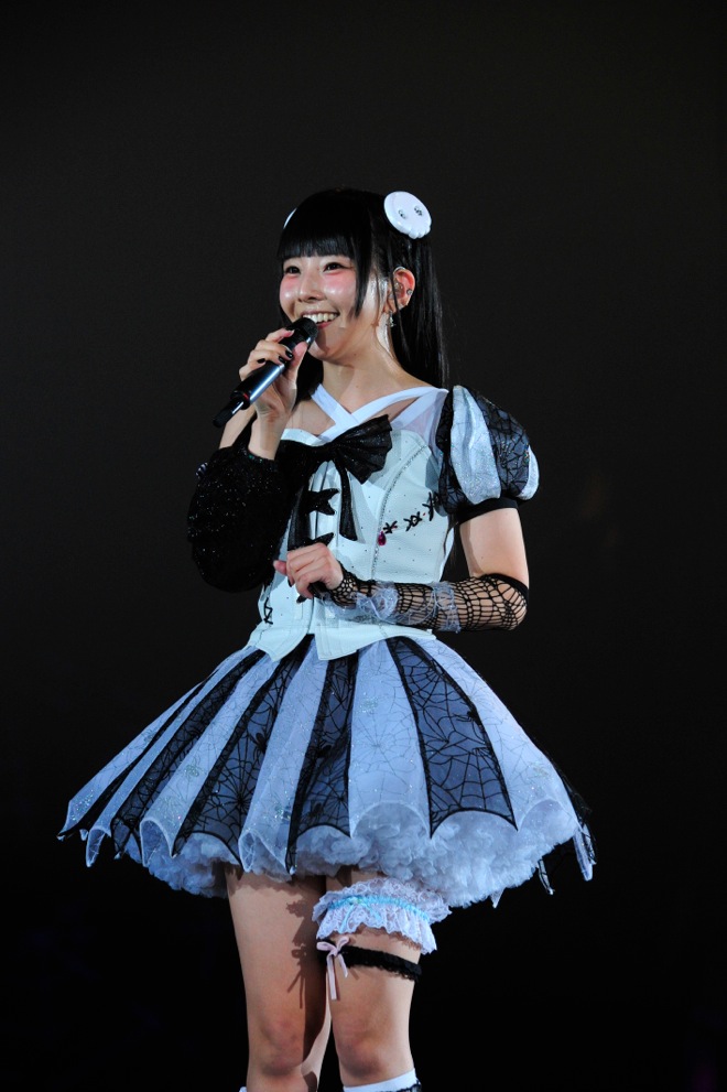 魔女に扮した古川未鈴が会場を見渡して「いろんなモンスターがいらっしゃるんですけど、ふだんは地球で隠れて生きてらっしゃるんですか?」と問いかけ、相沢梨紗が「でんぱ組.incは家っていう魔界からやってきました」とオタクアイドル全開のトークから、ダンスチューン「ちゅるりちゅるりら」へ。会場にサイリウムが揺れる中、振り付けをレクチャーし、ミドルバラード「イツカハルカカナタ」では、オーディエンスが腕を横に振る光景が広がった。