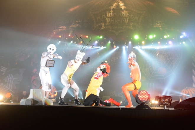 この後はHALLOWEEN JUNKEY ORCHESTRAの全員が紹介され、分島花音は「1年通してハロウィンしか楽しいことないんですよ」と淋しそう。初参戦のHiroは「僕の人生で史上最高に楽しいイベントだった」と話し、青木隆治は口マネでフィナーレの花火の音を再現、鬼龍院はマクドナルドのベンチに「それ、俺たち座れたりします?」と言われ、空気椅子状態でHYDEとDAIGOが横に座り、最後まで体を張った展開となった。