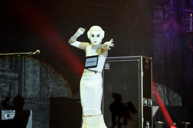 メンバー紹介を終えて、「抱きしめてシュヴァルツ」に突入するとライヴはさらにカオスに。Pepperくんが料理の作り方をレクチャーしようとすると、途中でR指定のエロい画像に切り替わってしまったり、Pepperくんの調子が悪くなって突然、煙を噴いて倒れてしまったり、騒然&爆笑のライヴが繰り広げられた。「毒グモ女(萌え燃え編)」ではエンディングでうぃっしゅポーズも飛び出し、鬼龍院が「DAIGOさん、ごめんなさい」と小声で謝る場面も。ラストはベンチもコンタックのカプセルの頭もとっぱらってボンボンを持ってランウェイを全力疾走し、「女々しくて」で盛大なエンディングを迎えた。その身体を張ってのエンタメ魂に大きな拍手と歓声が送られたのは言うまでもない。