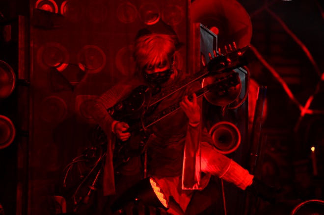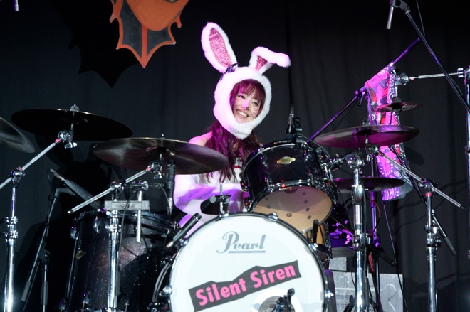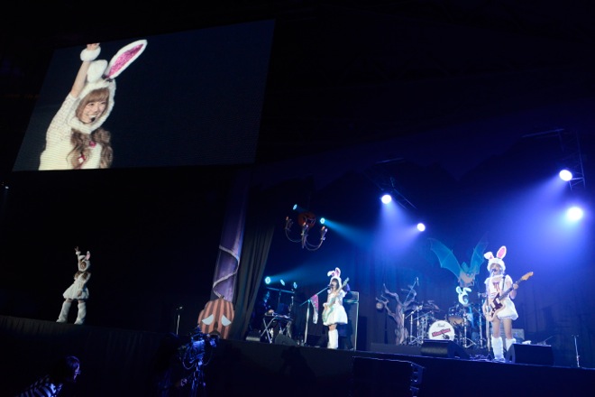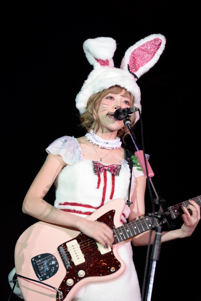 サイサイ風味つけのダンスナンバー「DanceMusiQ」も盛りこまれ、ヴォーカルのすぅは「去年は神戸に出演させてもらったんですが、今年も参加できて嬉しいです」と感謝のメッセージを伝え、去年の仮装(アダムスファミリー)で、HYDEにそこまでやらなくても大丈夫とアドバイスされたこともあって、今年は王道のウサギ仮装に決めたというエピソードを明かした。ラストナンバーはみんながタオルを振る曲「ぐるぐるワンダーランド」で、盛り上げ隊長(?)、ゆかるん(Key)も持場を離れて煽る、煽る。3曲という短いステージながら、バンドのプリミティブな魅力を伝えてくれた。