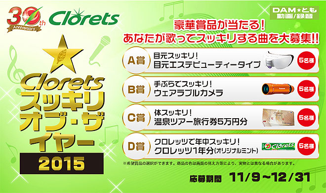 1985年の日本発売以来、30年間に渡り“息スッキリ”をお届けし続けてきたクロレッツが、この年末に送る<Cloretsスッキリオブ・ザ・イヤー2015>。DAM★ともでは、あなたが歌ってスッキリする曲を大募集、抽選で豪華賞品をプレゼントする。