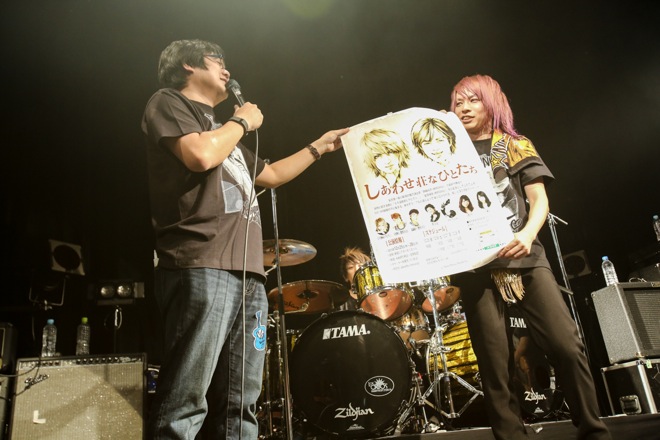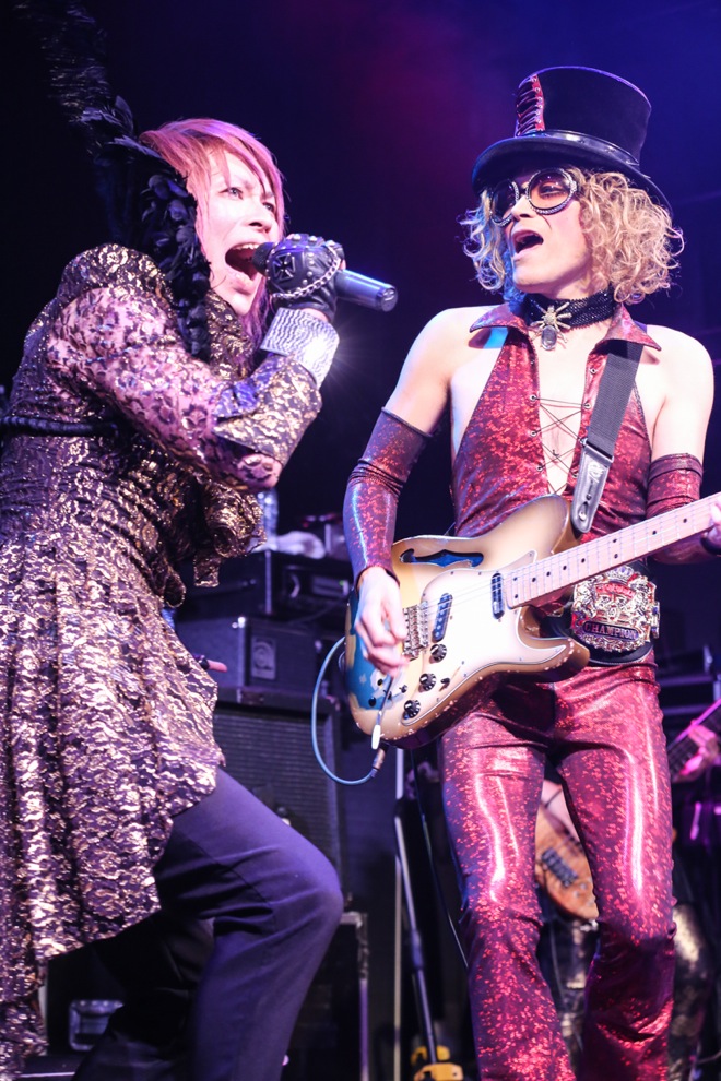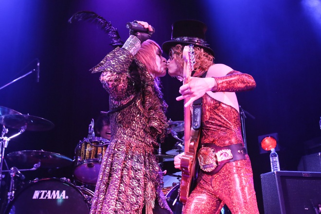 ド派手な赤のタイツ姿で登場するや、ピクピクン☆に唇を重ねるROLLY。「運命のいたずらというのでしょうか? twitterで偶然辿り着いた、ピクピクン☆という男は精魂込めて真心込めてエロを語っていて。一発で興味を持った僕は、“この人はいい人だ、友達になりたい!”と思ったんです」と、ピクピクン☆との出会いを語ったROLLY。「「いつかピク先生のギターを弾きたい」とおっしゃってくれて、今日はひとつ夢が叶いましたー!」と感激の表情を浮かべるピクピクンと共に披露した曲はなんと、すかんちの代表曲「恋のマジックポーション」。“新旧エロ対決”と言える、ピクピクン☆とROLLYのツインボーカルが実現したこの曲。妖艶に絡み合う二人のボーカルに観客も大興奮だ。