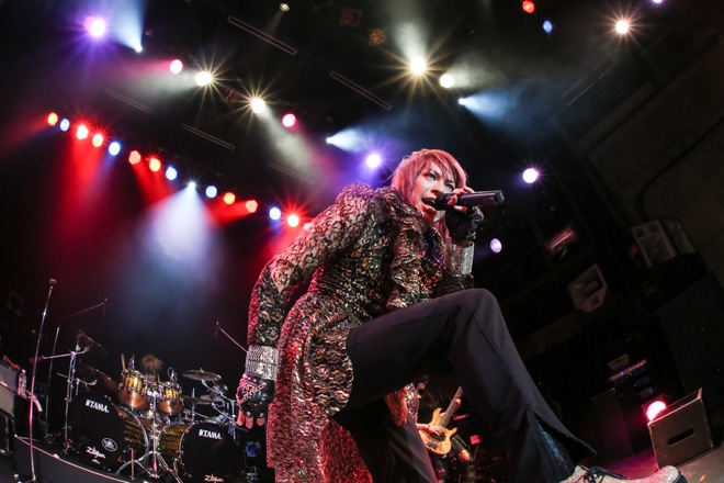 開演時間を少し過ぎた頃、SEに乗せてバンドメンバーが登場。それに続いて「ピク様ーー!」の黄色い声援に包まれ、ブラックとゴールドを基調としたゴージャスな衣装でピクピクン☆がステージへ。1曲目「千紫万紅アナタは万華鏡」のパワフルなバンドサウンドに乗せた逞しく艶やかなピクピクン☆のボーカルでライブがスタートした。「渋谷イクよ、トバしてイキますか!」と煽ると、「赤いLUNAうさぎ」でステージ上に大量のタンポンが投げ入れたり、「まったりネッチョリたっぷりドッピュリ☆」にヘドバンをあわせたり、前半戦からピクラー(ファンの呼称)も一体となってライブを盛り上げていく。