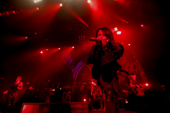定刻の6:66(7時06分)を告げる映像が舞台を覆う幕に投影され、その幕が左右に開くと真っ赤なバックライトに照らされて5人のメンバーが浮かび上がった。「始めようか、ZEPP TOKYO!」というHiroのひと言に導かれたナンバーは最新シングル「ALONE」。のっけからの全開モードが、5人のほとばしるパフォーマンスからダイレクトに伝わってくる。<HALLOWEEN PARTY 2015>の神戸および幕張公演にも参加した彼らのステージは、序盤から遠慮などない。